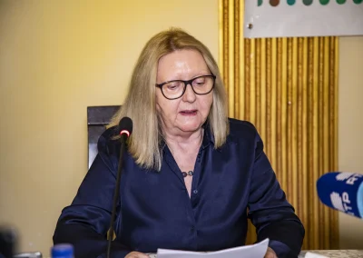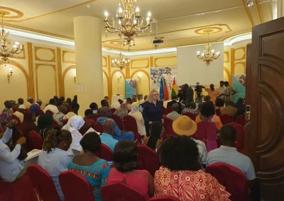 Carolina Quina, Administradora do Instituto Marquês de Valle Flôr (IMVF)[5], que conjuntamente com a LGDH, implementa o projecto Observatório da Paz, financiado pela União Europeia e pela Cooperação Portuguesa através do Camões – Instituto da Cooperação e da Língua, I.P., o qual tem adotado uma metodologia em cascata e multiatores, com uma profunda articulação com as autoridades locais, com destaque para o Ministério da Justiça e Direitos Humanos, as organizações da sociedade civil, as associações de carácter religioso, associações que trabalham as causas das mulheres e dos jovens, entre outros parceiros do desenvolvimento. Segundo a Administradora do IMVF, “mais de 3.000 pessoas foram sensibilizadas no quadro deste projeto, das quais 1.415 são mulheres, em mais de 40 eventos e iniciativas”. Quina elencou algum dos marcos mais recentes, como a 3.ª Roda de Mulheres, uma iniciativa que congregou 200 mulheres no Bairro Militar em janeiro de 2025, numa parceria com o Ministério da Justiça e dos Direitos Humanos e o Fórum de Intervenção Social das Jovens Raparigas (FINJOR). Com enfoque no papel das mulheres na prevenção do radicalismo e extremismo violento, Carolina Quina referiu ainda o Encontro Nacional das Mulheres em dezembro de 2024, iniciativa conjunta com o Ministério da Mulher, Família e Solidariedade Social.