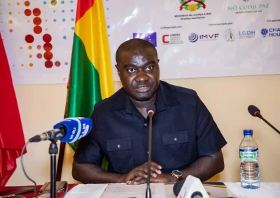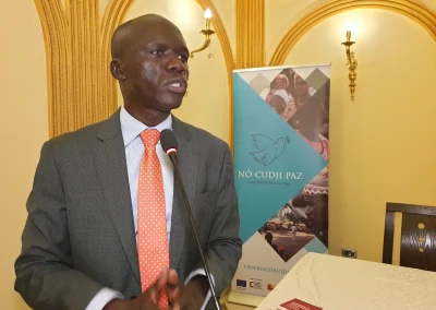 Domingos Correia começa por referir que “o Ministério da Justiça e dos Direitos Humanos, tem acompanhado nos últimos três anos com bastante atenção e necessária colaboração institucional, as várias iniciativas de formações dos diferentes atores nacionais, a promoção de diálogo interreligioso, a sensibilização e a educação cívica”, que têm sido desenvolvidas pelo Observatório da Paz – Nô Cudji paz[4] no âmbito do qual se realizou o presente evento, para a prevenção do radicalismo e extremismo violento na Guiné-Bissau.